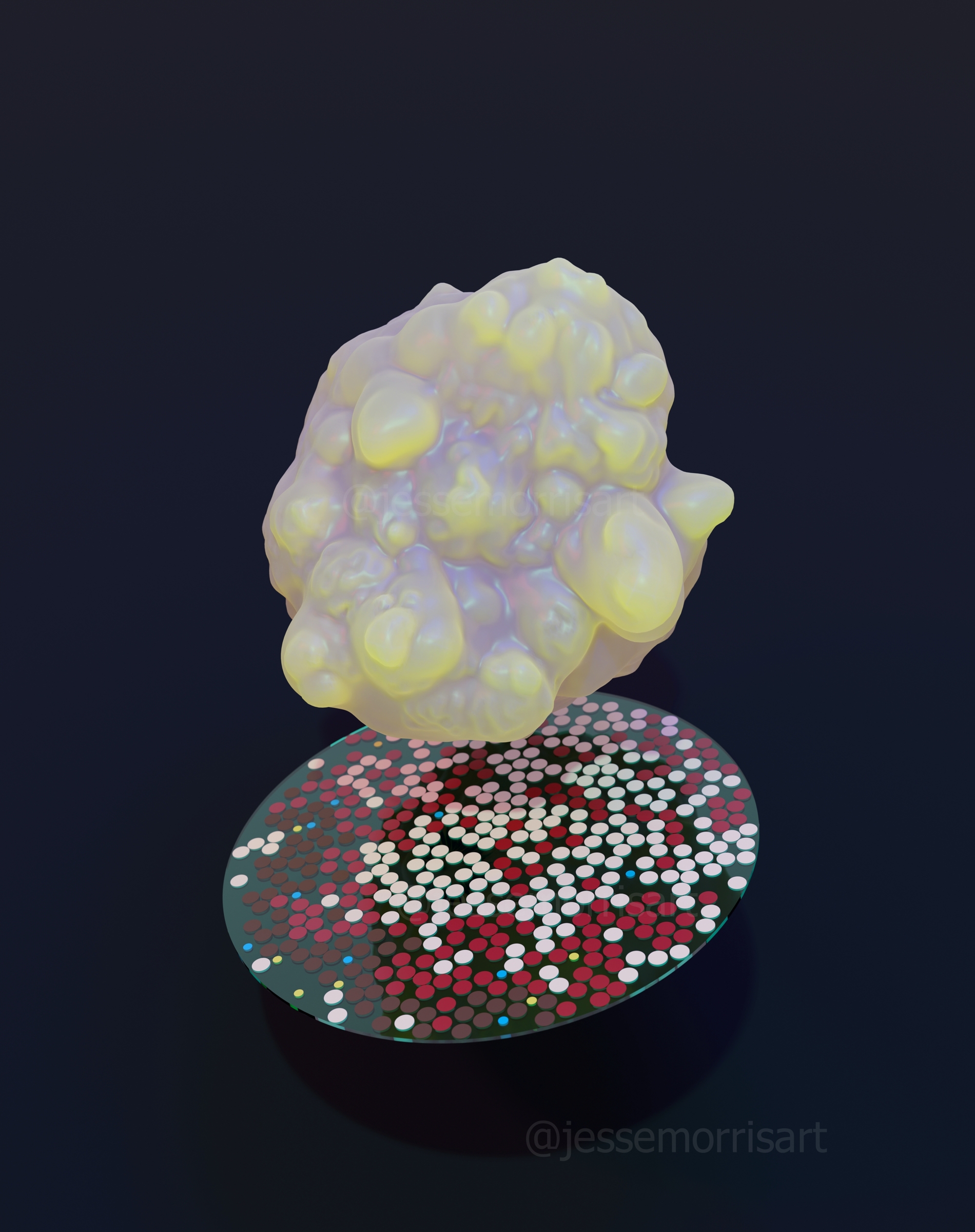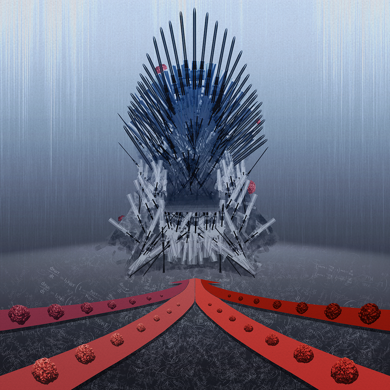 PLoS Computational Biology Issue Cover Image: “Game of Clones – Resistance is Coming.” Cooperative adaptation to therapy (CAT) confers resistance in heterogeneous non-small cell lung cancer. The image depicts clones of cancer cells converging in a unified, cooperative fashion on an iron throne of ‘medicine’. The use of game theory mathematical modeling is represented by the ‘foundation’, which supports the overtaking of the ‘throne’!
