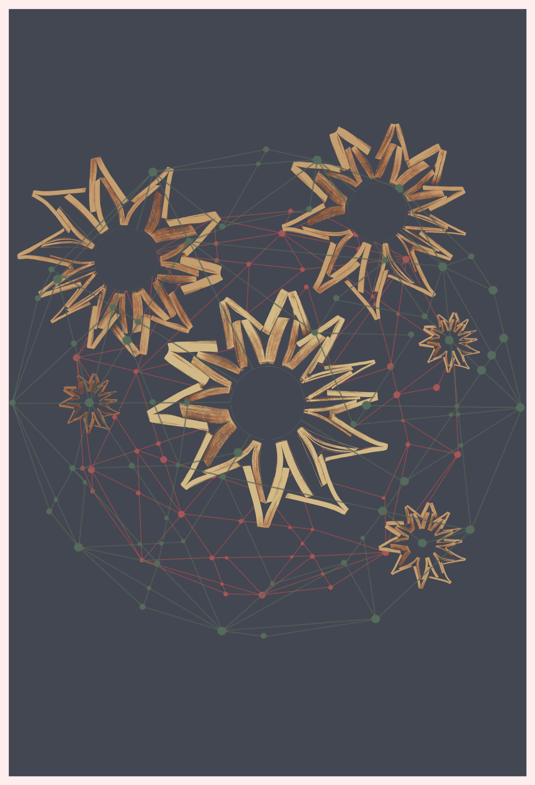 “Connected Books” Poster illustration and graphic for conference. Digital Humanities Beyond Modern English – Computational Analysis of Premodern and Non-Western Literature, Neukom Institute, Dartmouth, Hanover, NH